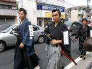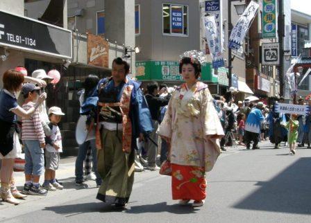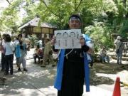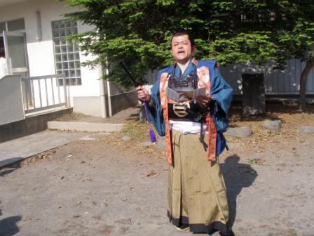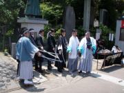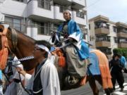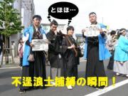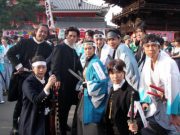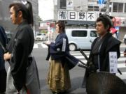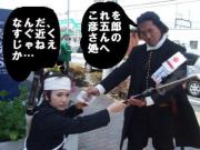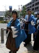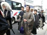 さてまずは日野宿本陣前での抜刀・勝ち鬨のパフォーマンス,沿道のお客さんも各自のカメラで盛んに写真を撮っていた.また,ウチのKをはじめ,まりもさん,トロさんといった前夜祭でご一緒させていただいた方々も盛んにカメラのシャッターを切っていた. |