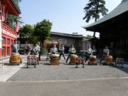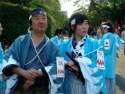 行進する隊士それぞれ飲み物を頂いていくのだが,どうやら今年は緑茶とウーロン茶の2種類があったらしく,「あたしそっちの方が良かった」と言っている隊士もいた.ここの給水スポットはマラソンの給水所のようなもので,受け取るとそのまま歩きながら飲み,100メートル先にある回収ポイントで空き缶を捨てるシステムだ.一昨年の五番隊などは隊長の音頭でみんなで一斉に飲んだのだが,さすがに沖田総司はそんな野暮なことはしなかった.