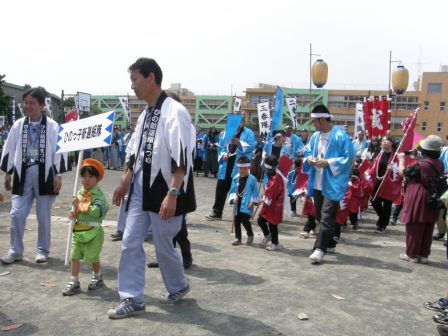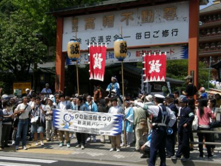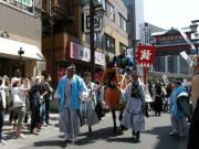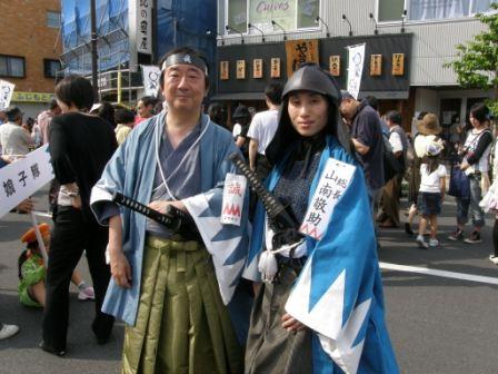 第一小学校を出たパレードは最初ローカルな道路を静々と進んでいたが,やがて大きな通りに出る.甲州街道だ.ここから一気に観客が増え気分も舞い上がる.ここは道路の半分を通行止めにして行進していく.昨年は規制時間を短縮するため四列縦隊だったのだが,今年は以前の二列に戻っていた.昨年は四列のおかげて行進がスムーズに行ったのだが,やっぱり四列だと内側に入った場合沿道の方々との交流が図りにくいので個人的には今年のような二列がいいなと思ったのだった(その代り隊列が長くなるので,あちこちで待ち時間が発生してしまうのだが).