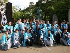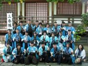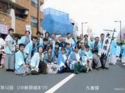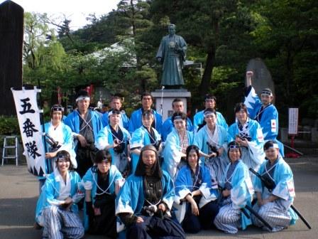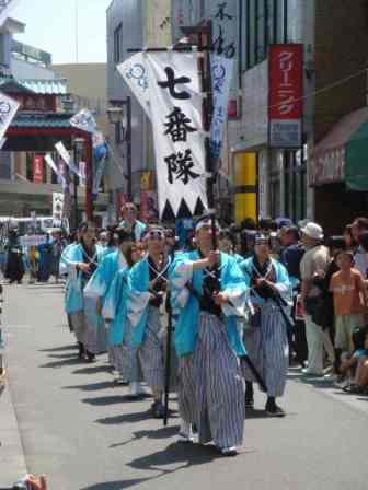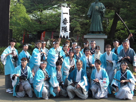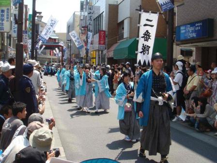 給水スポットを通過すると,井上源三郎のお墓がある宝泉寺を右手に見ながら進んでいく.ここが最後のパフォーマンススポットとなるスーパーいなげや前である.ここでは道路を完全に閉鎖してのパフォーマンスコンテスト,各団体が次々に自慢のパフォーマンスを披露していた.例年だとはるか前方で繰り広げられているパフォーマンスなど見えるはずもないのだが,今年は一番隊の特権としてある程度は見ることができた.
