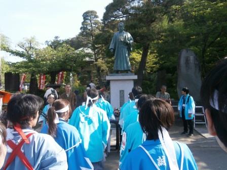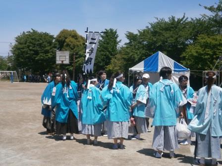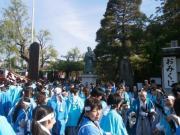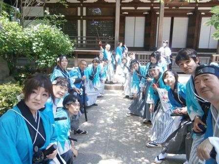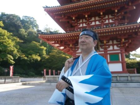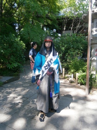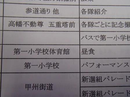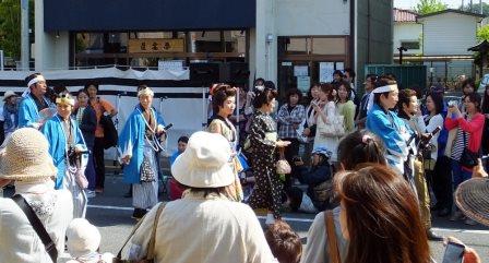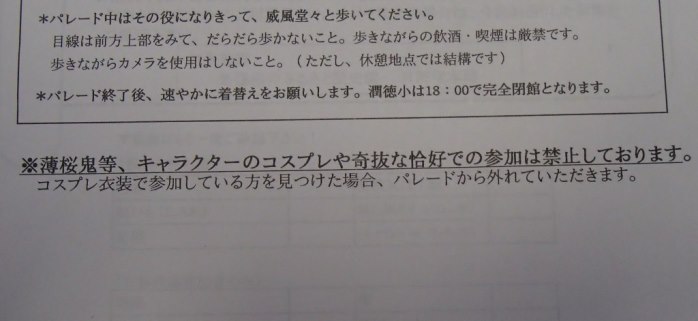 休息の後,2回目のパレードの開始となる.この2回目はパフォーマンス回ということで,各パフォーマンス隊はそれぞれのパフォーマンスを披露するのだが,我々一番隊はというと,途中で新政府軍の銃撃を受け,それに対して何らかのリアクションをせよという指令がでていた(笑).これについてはみんなで相談した結果,銃撃を受けて隊士はひるむものの,沖田総司が「そんなもので俺たちは倒せねえ,行くぞ!」みたいなことを言って敵をにらみつけて去るというパターンになった.で,いったいどこでその襲撃があるのかと聞いたら,ガソリンスタンドのところとのこと,スタンドなんてあったかなぁと思った皇帝だった.