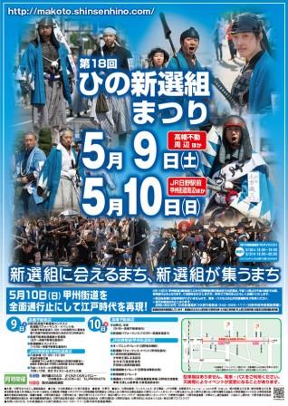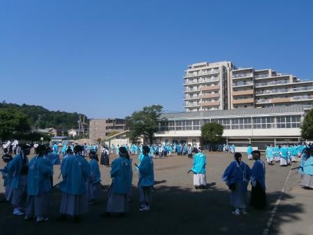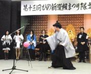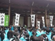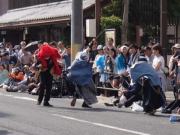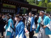 それでもしばらくしてようやく隊列が動き始め,参道パフォーマンスの開始である.騎乗の土方歳三,近藤勇に続いて一番から十番まで順に参道を進んで紹介を受け,各隊最初の勝鬨をあげた.ちなみに各隊紹介の際,「隊長を務めますのは○△から参加の◆●さんです」みたいな口上が述べられるが,八番隊の藤堂平助のところのみ,「新選組が好きで日野に移住した◇○さんです」と紹介されて,当の平助役の方が「なんで私だけそんな紹介なんですか!」と言ってて,近くの人が「身内だからじゃない」と答えていたやり取りが面白かった(笑).