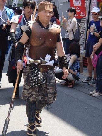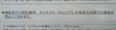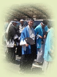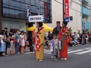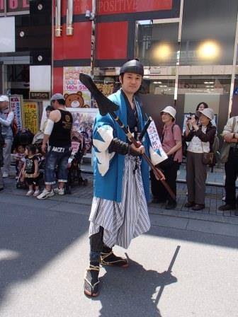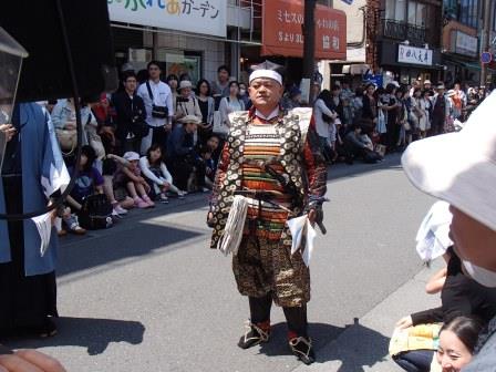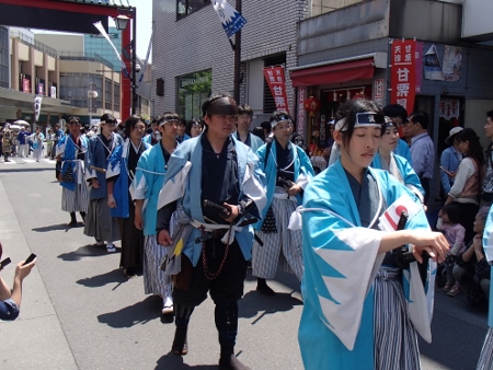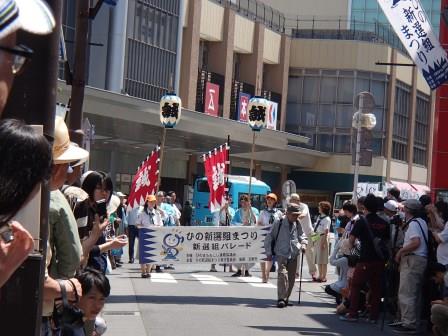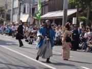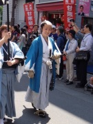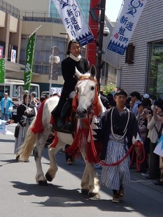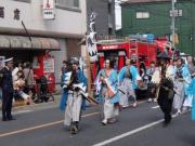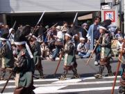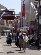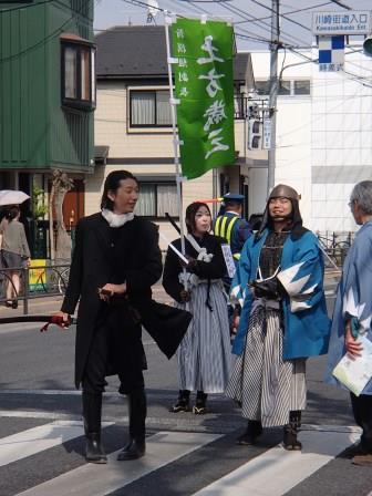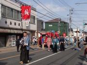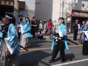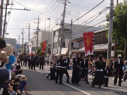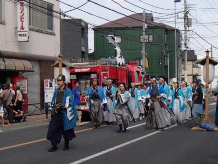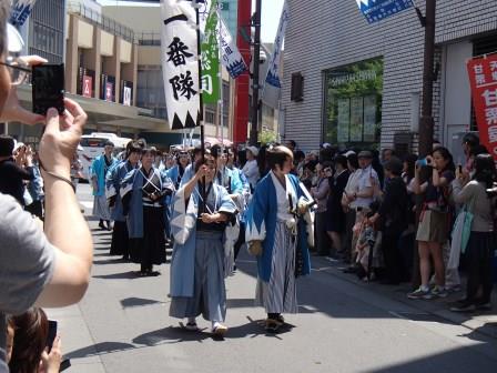 さて一同高張提灯と隊旗を先頭に,ミスター土方,近藤勇と続き,以下建制順に本隊が進む.七番隊は後半なのでしばらく銅像前で待機した後の出発だった.隊列は隊長を先頭に伍長のエルサブと旗持ち,その後に参加回数の少なくて若い人たちが続き,私とかくさん,宮新のK君,黒装束の3人衆が殿だった.