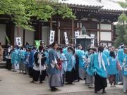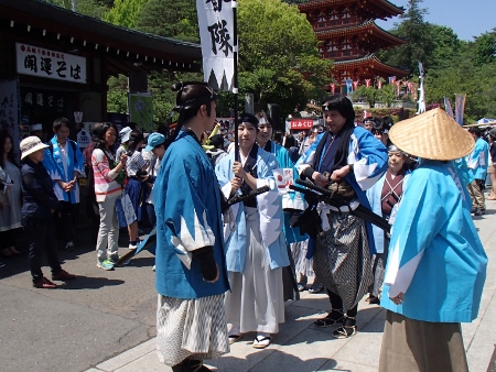 出陣式が終わると参道を下って今度は五重塔そばの土方歳三像前へ.これまた恒例の法楽である.ここでは貫主様による読経が行われ,隊士一同合掌する.この日は朝から快晴のお天気であり,この頃から強い日差しが容赦なく照り付けてくる.こりゃ熱い一日になりそうだ.
