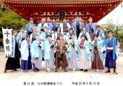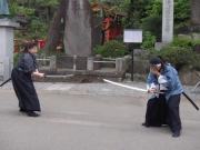 かくして第21回ひの新選組まつりは終了,過去には雨で午前中が中止(第11回),突発的事件で午後途中で中止(第15回)になった事例は経験しているが,午後になってからの雨天中止は初めての経験だった.この後は高幡地区に戻って着替えだけである.例によって建制順に出発するため,必然的に十番隊は待つことに.空いた時間で記念写真を撮ったりして過ごした(この時の写真だれかいただけませんか〜).しばらくして係員がやってきて,「じゃあ皆さんバス乗り場に向かってください」と誘導されて外に出る. |