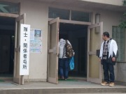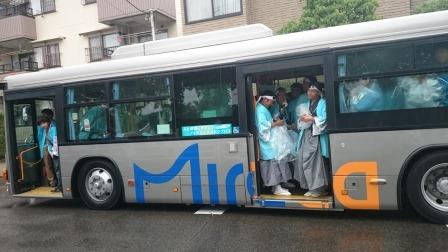 外は本降りになっていたため,一同体育館っで配られた臨時雨合羽を被って歩く.乗り場に着いたらちょうど満員のバスが出発するところだった.我々の前八番隊が乗り込んだところで満員になったらしく,少し待つように指示された.