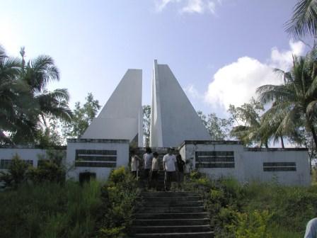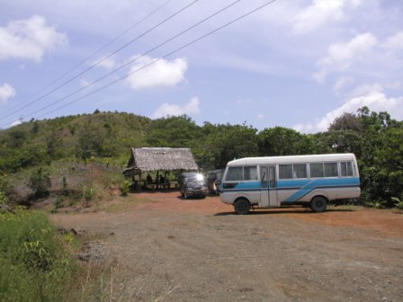 まずはロビーに集合し,車に乗ってバベルダオブ島へと向かう.実はパラオは近い将来,首都機能をこちらのバベルダオブ島にあるマルキョク州に移転する予定らしく,我々がこの辺を通った時も,幹線道路の整備のための工事がいたるところで行われていた.しかしかなり道が悪いところも依然としてあり,ガイドによるとこの数日の大雨で道路のコンディションがかなり悪くなっていたが,今日になっていくらか改善されたということであった.(今日のコンディションが落ち着いているのは,やはり我々の日頃の行いが良かったせいか? 笑)