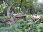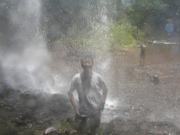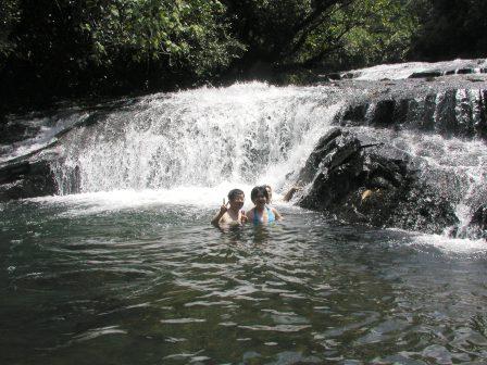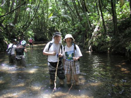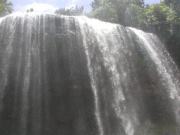 我々はまた坂を下り,再び森に入って噂の沢へと出た.清流である.これからこの沢伝いに歩いて(あるいはこの沢に入って)行けば、いずれ滝へとたどり着く寸法である.途中にはロープにつかまって歩かなければならない箇所もある.まさに探検気分である.この沢では,体長2〜3mmあるかないかという,極小サイズの蛙が多数生息しているのが見られた.これはオタマジャクシから変態して間もない個体で,いずれそれなりのサイズに大きくなるものなのか,それともこれ以上大きくならない種類なのかはわからない. 沢伝いにしばらく歩いていくと,木々の間からすだれのように水が落ちている様が見える.おお,これこそがあのガラスマオの滝である. |