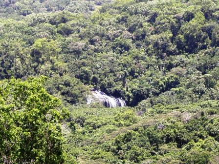 我々はジャングルを抜け,熱帯特有の赤茶けた大地を踏みしめて,滝へと歩いてゆく.途中,森が開けたところまで歩いてゆくと,彼方に滝が見えるではないか.もしかしたら結構近いのかも……と,一瞬期待を寄せるのだが,現実はそんなに甘くはない,まだまだ我々は歩かねばならないのだ.何しろ,まだ我々は沢を歩いていないのであるから.
