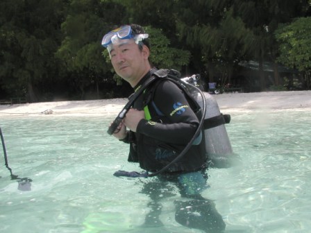 さて,この体験ダイビングは,ダイビングのライセンスを持たない者が,インストラクター同伴で潜るというシロモノなのであるが,素人相手であるから,当然十分な説明を聞いておかなければならない.まずは島の休憩所での,インストラクターによるブリーフィング(説明)である.まず我々は,酸素ボンベが必要な深度まで潜るわけであるから,水中では陸上とどう勝手が違うのか,また潜るためにはどんな機材が必要で,どう使うのか,きちんと理解しておかねばならない.我々はここで基本的な知識と動作を教えていただいた.なお,このとき説明に当たっていたインストラクター氏は,その話しぶりが何となくうちの合唱団のコンサートマスター氏に似ているような気がした.