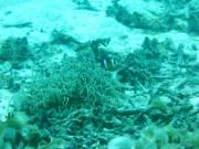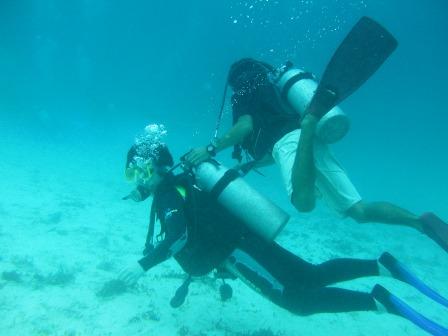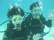 機材の使い方を練習した後,いよいよ実際に潜っていくこととなった.水中で意思の疎通を図るためには,手の動作によるサインのほかに,水中でも使用できるホワイトボードでの筆談がある.まさか水中で口頭による会話をするわけにもいかないので,水中ではまさに沈黙の世界である.(それでも比較的明るい海中なので,別に悲壮感があるわけではないのだが)海中に潜ってしばらくした後,急にKの様子がおかしくなった.いきなりボコボコ言って苦しみだしたのである.実は我々は休憩所での説明の際に,水中でマスクのゴーグルの内側が曇った際の対処法として,マスククリアの方法を習ったのであるが,どうもそれをやろうとして失敗してしまったらしい.幸いインストラクター氏の対応により事なきを得たようであるが,Kは「あのまま死ぬかと思った」と語っていた.そんなこともありながら,我々は何とか酸素ボンベを背負っての海中散歩を楽しむことができた.普段はテレビか,せいぜいシュノーケリングで海面すれすれのところからしか見ることのできない海の中の様子を,まさに至近距離から見ることができたのである. |