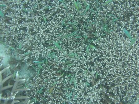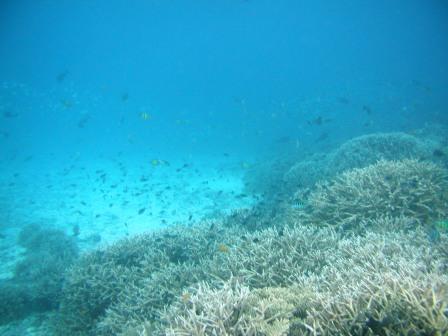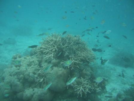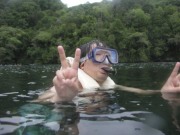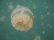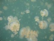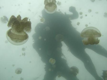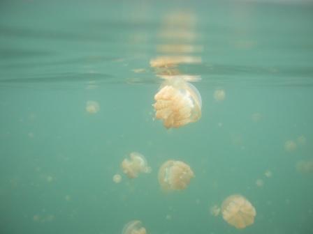 湖の水温は,所々でやや冷たい水流があるものの,おおむね心地よいぬるさであった.湖の中心部へ向かって泳いでいくと,おお,いたるところで半透明のピンクかオレンジがかった体色のクラゲたちが,ふわふわと泳いでいるではないか.体長2〜3mmあるかないかの極小サイズから,両手のひらに乗るくらいのサイズのものまで,全く同じ姿かたちでふわふわ,ふわふわ泳いでいる.日本近海で大量発生して漁業に深刻な影響をもたらしている,悪名高い巨大越前クラゲと違い,こちらのクラゲたちの群舞は,なんとファンタスティックであることか.彼らの泳ぐ様を写真にとって加工すると,可愛らしい壁紙やテンプレートが作成できそうである.我々も早速,このクラゲたちの群舞の中で,かのヘッチャン氏に写真を撮ってもらった.しかしこのクラゲたちに我々が魅了される一方で,この絵に描いたような「クラゲ」そのものか,あるいはその寒天質の肌触りに恐れをなしたのか, |
