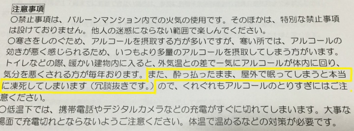 「酔っぱらったまま、屋外で眠ってしまうと本当に凍死してしまいます(冗談抜きです)」