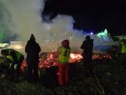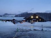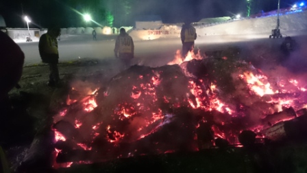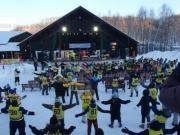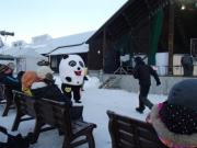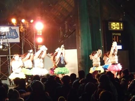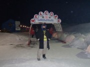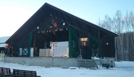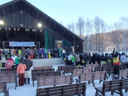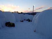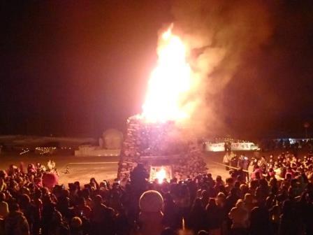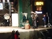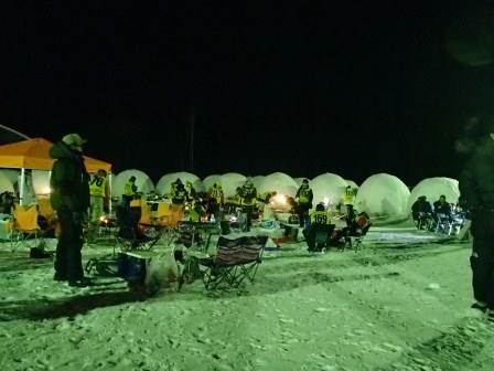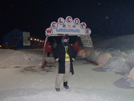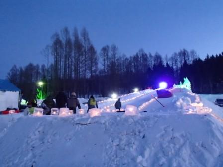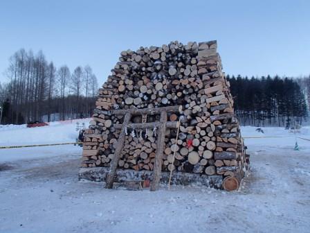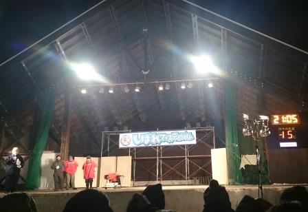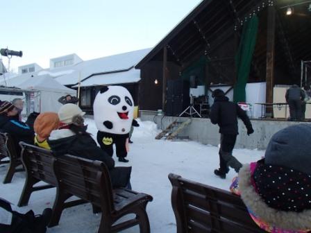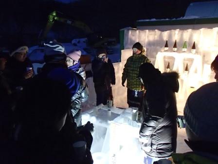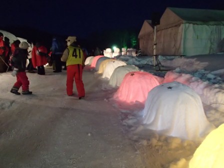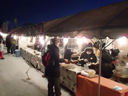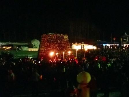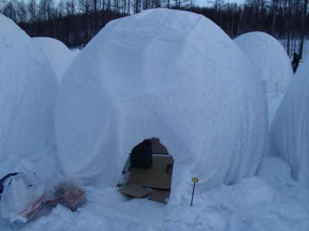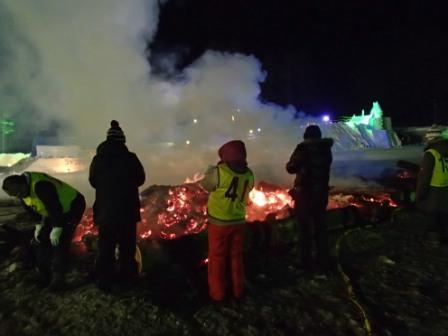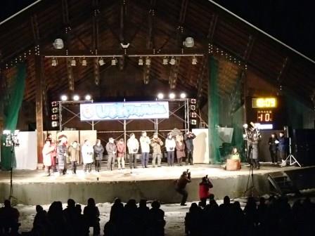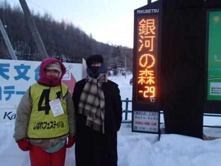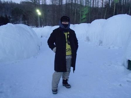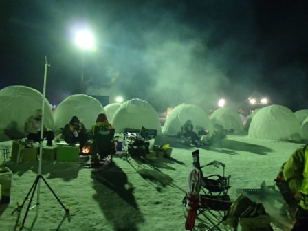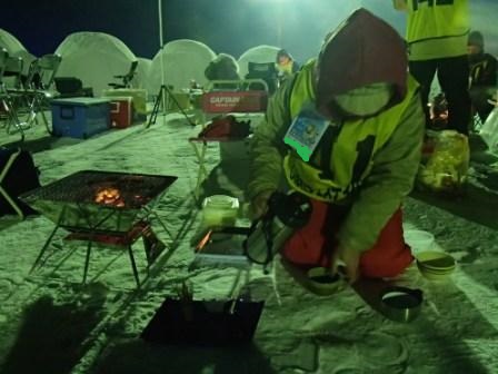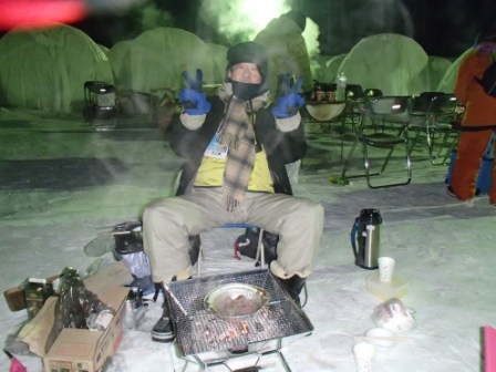 イベントセンターを出ると,外は一段と冷えていた.ステージの温度計を見ると,なんと!マイナス20℃,ついに大台に乗った.周辺を見渡すと何とな く大気に靄がかかったように見える.この後は寒さと戦って朝までいかにして過ごすかという時間である.我々はバルーンマンション広場でコンロを焚くことにした.コンロに帯広のホームセンターで購入した着火剤と炭をセットしてチャッカマンで着火,と意気込んだのだが…