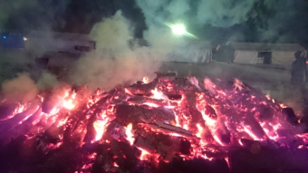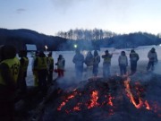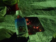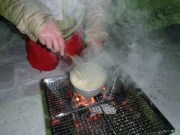 その後も焼酎のお湯割りをチビチビやって時間をつぶす(お湯が不足してきたため会場内の水場で調達した水をコンロで沸かした.ちなみに炭が余ってもしょうがないので全部くべたため火力はかなりあった).そうこうしているうちにも気温はどんどん下がり周囲では,「今マイナス23℃になった」,「ついに24℃だ」と盛り上がっている.時計を見ると3時半過ぎ,さすがにこの頃になるとコンロの炭も勢いがなくなってきた. |