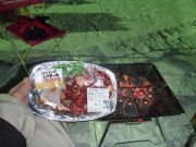 鍋が煮えるまでただ待ってるのも寂しいので,魔法瓶のお湯を使って焼酎のお湯割りをやることに.お湯は熱いのだが,焼酎が冷え切っているために割った段階で既にお風呂のお湯くらいの感じ,しかも外気のために一口飲むごとにどんどん冷たくなり,数分後には水割りになってしまった(さらに20分くらい放置すればオンザロックになりそう).そんな環境でも炭火の火力はすごく,豚鍋さらにはガーリックステーキとスタミナの付きそうな夜食をいただいた(ステーキは網で直接焼くと後の掃除が大変なので豚鍋の使用後のアルミ鍋を流用). |