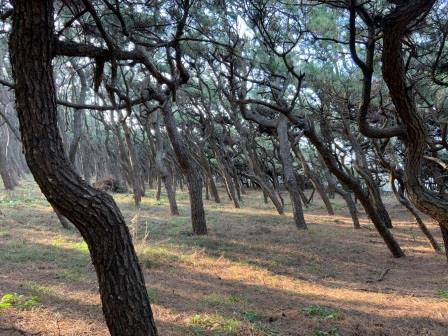 日本三大松原の最後,虹の松原は佐賀県北部玄界灘に面した唐津市にある.市街地を東西に分ける松浦川の右岸に当たり,街の中心であった唐津城とは川を隔てて反対側に位置する.長さは4.5キロメートル,総面積は216ヘクタールと三大松原の中では最大規模である.歴史的には万葉集の時代から知られていた三保の松原,気比の松原と違い,江戸時代初期の唐津藩主寺沢広高が自然林に手を加え植樹して造成されたものであり新しい松原といえる.名前の由来は松林の長さから「二里の松原」だったものが訛って「虹の松原」になったとされる.