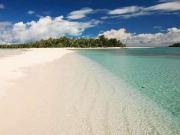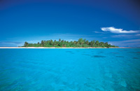 | しばらくしてイルカの群れは違う方向に行ってしまい,やがてボートの周辺は再びエメラルドグリーンに変わった.どうやらリーフの中に入ったようだ.ふと前方を見ると島影が… おおっ!カヤンゲル島だ.何とも言えないブルーの海に囲まれた白砂のビーチが見える.さっそく上陸かと思っていたら,この日は海の透明度が高いのでまずはシュノーケリングタイムとのことだった(島周囲の気象条件が刻一刻と変化するため,ツアーの順番は適宜順番が前後するらしい). |