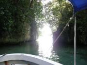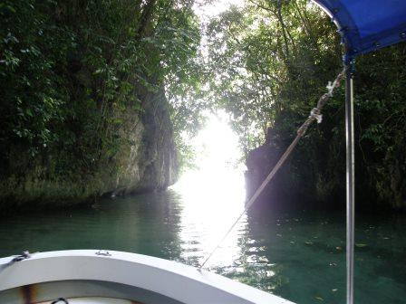 桟橋を出発したボートをKBブリッジを背にして南へと進んでいく.パラオは人間が居住している一部地域以外はひたすらジャングルに覆われた島ばかりである.桟橋を出て数分もすると周囲はあっという間にジャングル地帯となった.