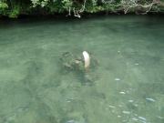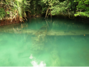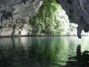 洞窟を後にして来た道を引き返し再びボートに乗り込む.狭い水道をさらに進んで行った先に,日本海軍の飛行機が沈んでいるスポットがあった.水がやや濁って入るものの,水深が極めて浅いために機体の形が明瞭に残っていた(機種不明だがおそらくは水上機であろう).そこからさらに進んだ先には大戦中に海軍の水上機格納庫として使われていた巨大な洞窟があった.案外さっきの飛行機は元々ここに収納されていたものかもしれない.洞窟入り口付近には朽ち果てた航空エンジンの姿も見られた.