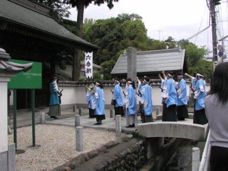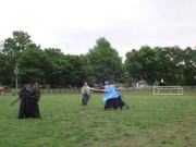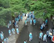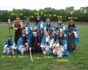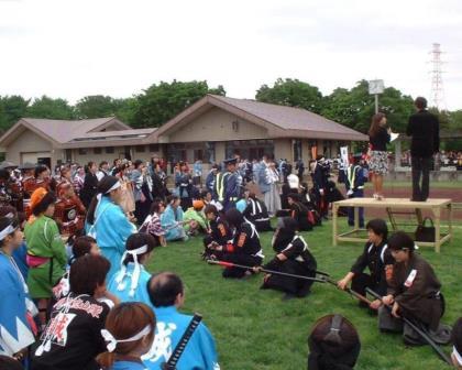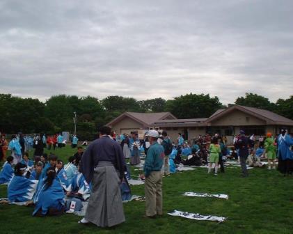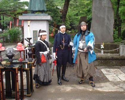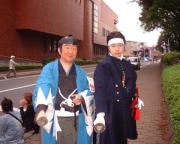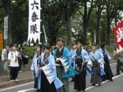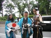 高幡地区のパレードは1時間もしないうちに終了し,全隊無事に高幡不動尊に帰ってきた.ここでしばしの休憩である.いつの間にか現れたKがあちこち歩き回って写真を撮ってくれていたらしかった(彼女の写真のおかげでパレードの他の部分での様子がわかった次第である.たしかにパレード参加者は自分の周りしか見えないからなぁ).沿道では官軍対幕府軍の合戦パフォーマンスなどが行われ,かなり賑やかだったとのことであった.そして私たちは11時半ごろに昼食会場であるスポーツ公園に移動するためバスに乗り込んだ(バスは早い者勝ちにどんどん出発した.我が六番隊はさっさと乗り込んだため早い段階で出発できた).噂では午後はさらに沢山の距離を歩くらしい.果たしてどうなるのか,期待と不安が入り混じるのだった. |