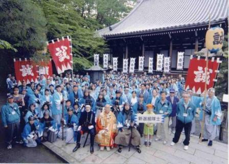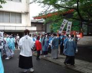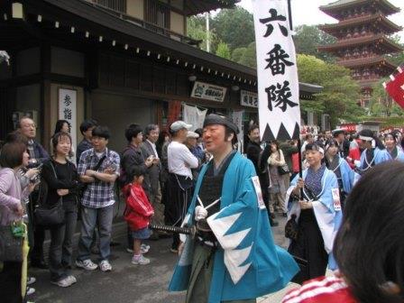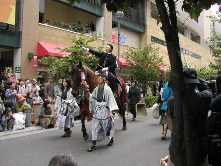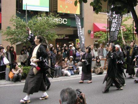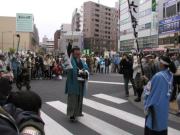 | 午前中は高幡地区のパレードである.パレードは新選組ゆかり隊(横須賀甲冑隊,流山隊,玉造隊,滝野川新選組隊,市谷柳町試衛館,新選組と出会った人々,会津藩など)が先導し本隊がそれに続く.本隊は騎乗した土方歳三とそれに続く市村鉄之助,近藤勇(副長が騎乗で局長が徒歩とは…….ひの新選組まつりの主役はなんと言っても土方歳三,そして一部井上源三郎であり,近藤勇は地味な存在なのであった),以下一番隊(沖田隊)から順に十番隊(原田隊)まで隊長を先頭に堂々と行進するのである.途中行進しながら抜刀−勝鬨−納刀のパフォーマンスをする(この納刀が難しい.さすがに我が六番隊はプロ集団で,隊長以外は皆スムーズにできていた).なるべく堂々と行進しようと胸を張って歩いていると沿道の見物客から「源さん,こっち向いて」,「源さん,頑張って」と盛んに声がかかる. |