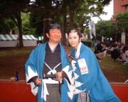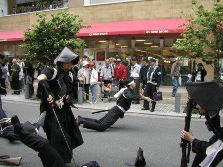うーん,源さんってこんなに人気があるんだ,地元の人たちに愛されているんだと感動した(私の地元の岩手での宮沢賢治,石川啄木に相当するのであろう).そして,こんな大事な役を自分なんかがもらっていいのだろうかと何となく申し訳ない気分にもなったのであった.遠くの方ではなにやらドンパチの音が聞こえる.なにやらパフォーマンスが行われているらしかった.また他の隊の勝鬨も聞こえてきて気分が大いに高まった.