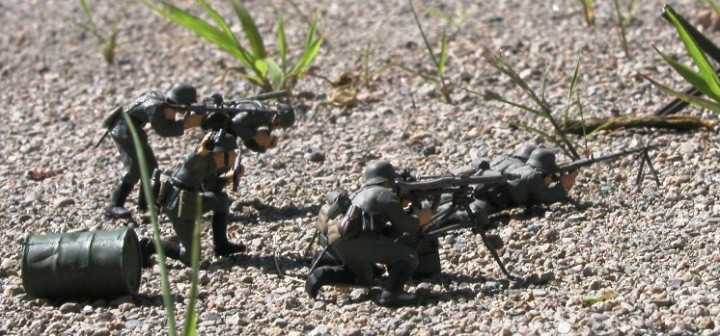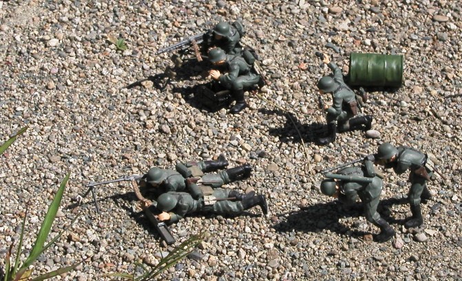 ドイツ軍の機関銃チームのセットである.本来人形は8体で重機関銃(MG42)手が2体,軽機関銃(MG38)が伏せ撃ち,肩撃ちそれぞれ2体ずつ,サブマシンガン(MP40)を持った下士官風の人形が1体(もう1体は紛失のため不明)である.脇に転がっているドラム缶は別売りのアクセサリーセットである.