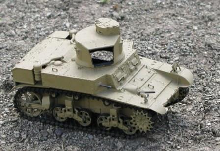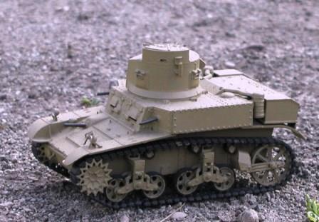 | 第二次大戦初期から各地で使用されたアメリカの軽戦車(イギリスやオーストラリアにも貸与されていた)である.ちなみにM3と呼ばれる戦車には,リー,グラントといった中戦車タイプもある.重量12.7トン,装甲38mm,主砲は37mmと小ぶりの戦車であるが,最高速度60km/hという高速を生かして偵察や敵陣地に対する攻撃などに活躍した.軽戦車であるため対戦車戦闘にはあまり向いていないように思われるが,太平洋戦線では日本軍の戦車が貧弱であったため,九五式軽戦車や九七式中戦車との戦闘では大いに活躍した.代表的なのが1942年のペグー山系での九五式軽戦車との戦車戦である.スチュアートは攻撃力(戦車砲は37mmと九五式と同じだが、長砲身のため威力は勝っていた),速力,装甲全てにおいて九五式軽戦車を上回っていたのである(日本軍最強の戦車は鹵獲したスチュアートだといわれる所以である).私が製作したものはかなりいい加減な造りで塗装も米軍特有のオリーブグリーンではなく(たまたまオリーブグリーンを切らしていたと思われる),砂漠戦用になっている.37mm戦車砲もとれてしまっている有様である. |