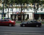 車はウィーン市内へと入っていくと,左手に川が見えてきた.ウィーンといえばドナウ川が有名なためこれをドナウ川と思う人も多いそうだが,ドナウ川はもっと郊外にあり,今見える川は運河らしかった.暫く走ると車はリンク通りに入っていった.リンクはウィーンの旧市街(元々のウィーンの町.16,17世紀のオスマントルコによるウィーン包囲で包囲されたのもこの部分である)を取り囲んでいた城壁のあったところで,今は路面電車の環状線が走っている.東京で言えば山手線,大阪なら大阪環状線のようなものだが規模ははるかに小さい(一周20〜30分程度).このリンク通りならびにリンクの内側にウィーンの見どころが詰まっている.今回我々が宿泊するグランドホテル・ウィーンはリンク通りの国立歌劇場や楽友協会の近くにある.これは,ヨーロッパのコンサートは日本に比べて開演時間が遅く,必然的に帰りも遅くなるため,治安の面を考えてホール近くにしたのと,リゾート型と違ってこういうアクティブに動く旅行では,ついつい買い物をしてしまい,荷物を置きにホテルに戻りたくなるシチュエーションが多いからである.今回のライブデスクの旅行者は全員このグランドホテルに宿泊であった. |
