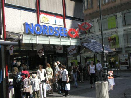 しばらく部屋でウダウダした後夕食に繰り出すことにする.長いフライトと時差で何となくボーっとしていることと,明日お昼から早速コンサートがある(ウィーンフィルの定演はなんと真昼に行われる)ことからこの日の夕食は軽く済ませようということになった.ホテルを出て国立歌劇場を左手に見ながらケルントナー通りを歩いていくと赤いお魚マークの店が目に入った.ここはヨーロッパ各地に店舗を持つ,”ノルトゼー(Nordsee 北海という意味)”という魚料理店である.セルフサービスで,値段が安く腹いっぱい食べられる店で,私も1991年のヨーロッパ旅行の際には何度も利用した. |