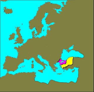 13世紀前半のビザンチン(ニカイア)帝国(黄色)とラテン帝国(ピンク)(文献3より改変) |
