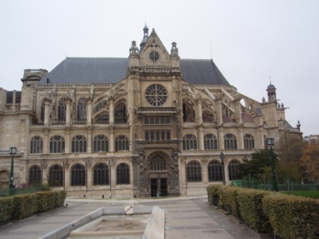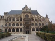 | 最後にモーツァルトの史跡めぐりの締めとして,我々は母マリア・アンナの葬儀が行われた,サン・トゥスタッシュ教会を訪ねることにした.ここは16世紀に建造されたパリで最も優美といわれる教会で,骨組みがゴシック様式,内装がルネサンス様式という変わったつくりになっている.またフランス史における各界著名人ともゆかりの深い教会としても知られ,モリエールやリシュリュー,ポンパドゥール侯爵夫人らがここで洗礼を受けている.音楽史の世界では,フランス近代音楽の祖ともいわれるベルリオーズ(1803〜1869)がここのオルガンを弾いていたそうである. |