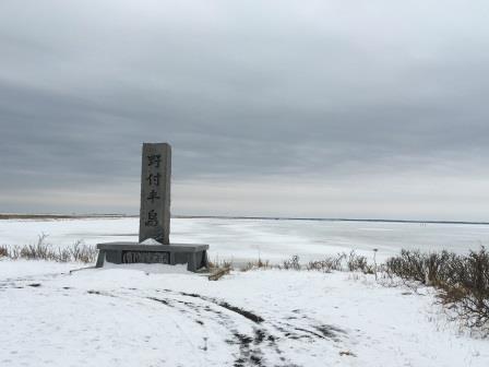 野付半島は日本最大規模の砂嘴であり,全長30キロ近くある半島である.トドワラ,ナラワラといった最果て感漂う立木枯れの風景が人気のスポットだ.夏はもちろんだが,冬でもそこそこ観光客の姿が見られるのだった(冬にはスノーシューを着用して半島先端を歩くツアーもあり,実際に参加している人がいた.自分も興味があったのだが今回は時間の関係でパス).もっともトドワラ自体は近年倒木が進みかなり数が減ってしまったらしい(1980年代の学生時代に訪問した際はまだ結構残っていたが…)