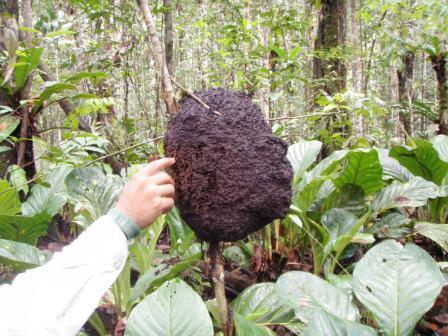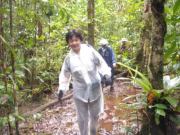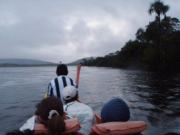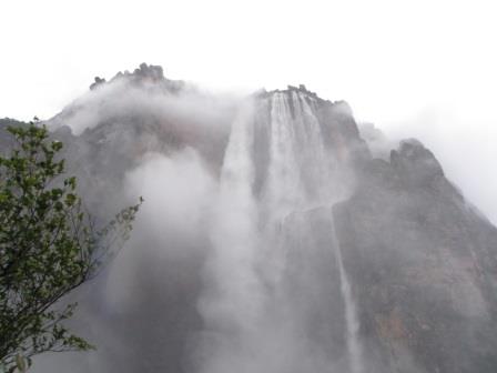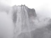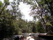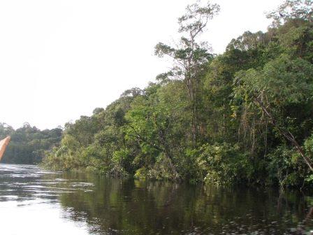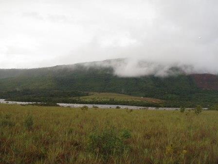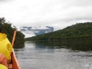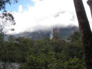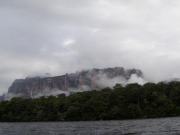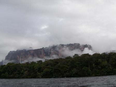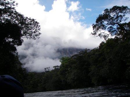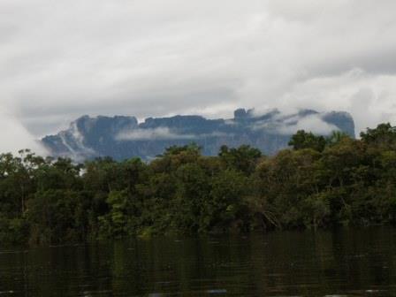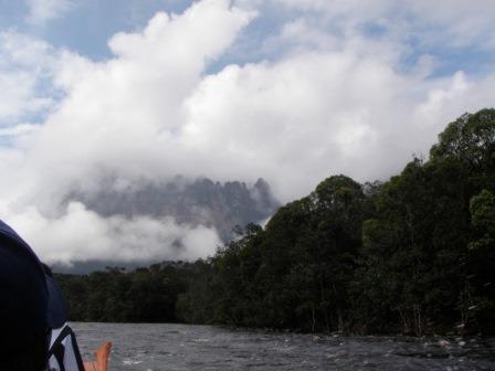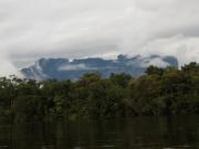 ボートはまたカラオ川を遡っていく.このころから少し空に晴れ間が出てきた(晴れ男の自分がきたんだからとひとりほくそ笑む 笑).ガイドの指さす方向にはアウヤンテプイが聳えているのが見える.巨大なテプイの頂上台地には雲が厚く垂れこめていた.こうして改めて見ても,ロンダルキアではないが,魔王の住む山という雰囲気が漂っている(ペモン語でアウヤンテプイは悪魔の山の意であるから,言いえて妙である).