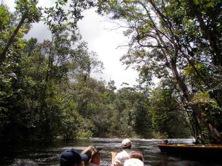 10分ほど進んでいくと,川が二岐になっているところに差し掛かり,ボートはは右側に入っていった.ここからが支流のチュルン川となる(カラオ川自体がカロニ川の支流だから,支流の支流ということになる).川幅もやや狭くなり周辺のジャングルが迫ってくる感じがした.ガイドブック等によると,チュルン川に入ると河底が浅くなるため,船は航路を探しながらゆっくり進むというようなことが書かれていたが,この日は水量が十分すぎるほどあるらしく,全く意に介さないかのように軽快に走っていた.