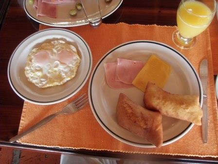 この日の朝は昨日の雨がウソのように晴れ渡る良いお天気だった.これなら遊覧飛行もなんとかなりそうな感じである.まずはレストランへ,この日の朝食は揚げパンと目玉焼き,そしてハムにチーズだった.