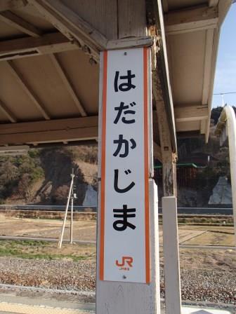 さっそく電車を降りてみる.はだかじま駅は島式のホームが1面で一応行き違いが可能な構造になっていた.定番の駅名標を見つけてさっそく写真を撮る.JRの駅のホームにはさらに付近の名所案内などもあるのだが,残念ながらヌーディストビーチに関する記載はなかった(笑). |