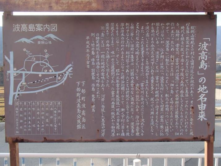 駅から道沿いに歩いていくと,なにやら看板が見える.行ってみると,このはだかじま(波高島)という地名の由来が書いてあった.それによると,昔まだ稲作ができず畑が主体だったところから「畑ヶ島」の地名が生まれ,それが転化したとも,付近を流れる富士川の急流からきた「波高き」が由来であるともいわれているとのことであった.