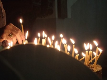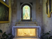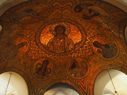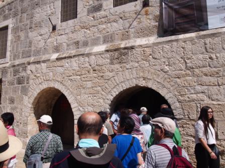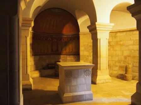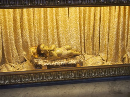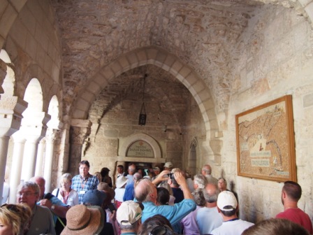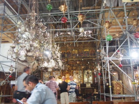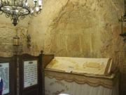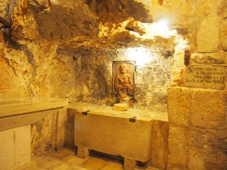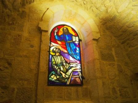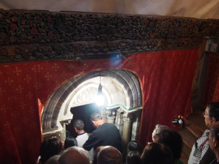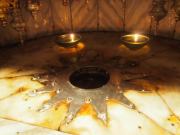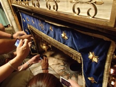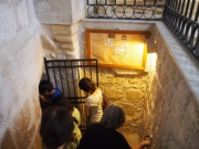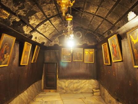 教会の聖堂は見慣れたカトリックらしいもの,ステンドグラスから差してくる光加減もカトリックだ.ここには生まれたばかりのイエスを模した人形があり,毎年クリスマスの時期になると,ここから先ほどの聖誕スポットまで運ばれるらしい.実はこのカトリックの聖堂と聖誕洞窟(ギリシャ正教管理)はドア1枚でつながっている.普段は宗派の垣根で遮断されているドアが,年に1度クリスマスの時にだけ開けられるというのが興味深い(七夕みたいだなと感じた).聖堂からは当時ヒエロニムスが籠ったとされる地下洞窟に降りることができる.ここで彼は聖書の翻訳作業を行っていたそうだ.,