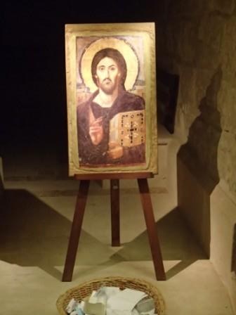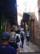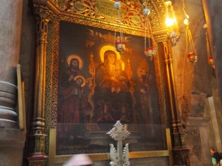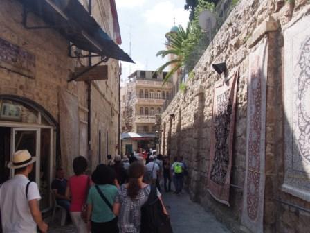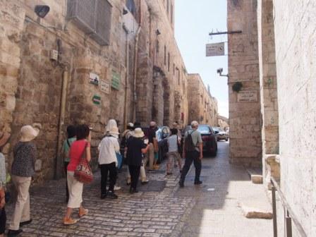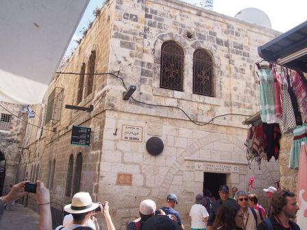 第5ステーションからのヴィア・ドロローサ通りは狭い歩行者専用,周囲にはお土産物屋が立ち並び賑やかな通りである.その途中に第6ステーションがあり,ベロニカという女がイエスの顔をハンカチで拭ったとされる場所である.今はギリシャ正教の聖堂が建っている. |