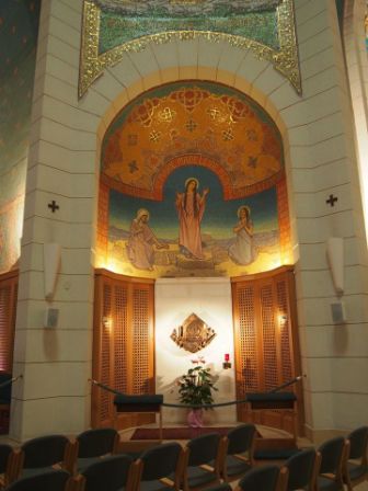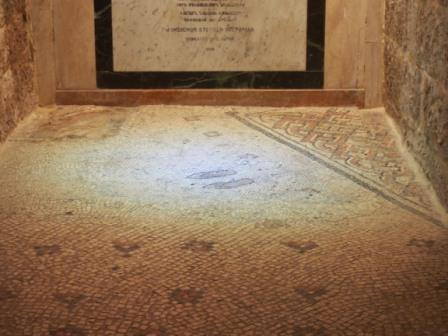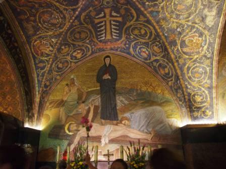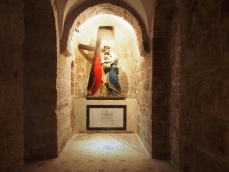第3ステーションの曲がり角を左折し南下して少し行った道の左側,十字架を背負ったイエスをマリアが目撃した場所とされている.このエピソードも聖書の記述にはない.ここの古い床にはビザンチン時代のモザイクがあり,そこにはマリアのサンダル跡が描かれている. |