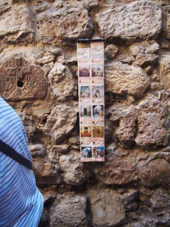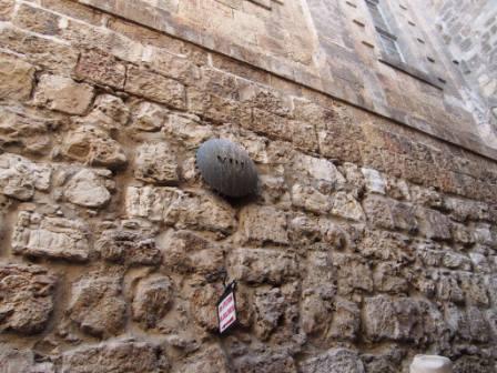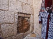 第4ステーションのすぐ先を右折してヴィア・ドロローサ通りに入る.そのすぐ南側に第5ステーションがあり,ここは兵士たちがイエスの十字架をキレネ人のシモンに担がせたとされるポイントだ(マルコ福音書の15章に記事あり).ここの壁には倒れかかったイエスが触れたとされる岩があり,歴史上数えきれない巡礼者たちが触ったため,かなりすり減っている. |