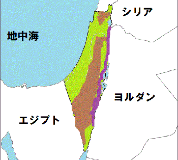 | イスラエルは地中海東岸に位置する南北に長い国である.南北方向には470キロあるが東西方向には130キロ程度しかない.北にレバノン,北東部にシリア,東にヨルダン,南西にエジプトといずれもイスラム教の国々と国境を接している.またヨルダンとの国境を形成するヨルダン川の西岸部(ヨルダン川西岸地区)と地中海に面しエジプトと隣接する地域(ガザ地区)はパレスチナ国の領域となっている(日本政府はパレスチナを国歌として承認していないためパレスチナ自治政府と呼称). |