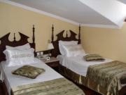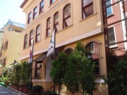| 概要で記したようにイスタンブールには旧市街と新市街があり,欧米風の大型ホテルは全て新市街にある(日本からの団体客も大抵はここに泊まる).一方旧市街は中世風の狭い町並みに加えて,世界遺産にも登録されたため,新規に大型ホテルを建てるのは困難である.そのためオスマン帝国時代に政府高官の住居だった家を改造した小さなホテル(プチホテル)が散在しており,我々の宿泊地もこうしたプチホテルのひとつなのだった.今回宿泊するのはアレナホテルという,旧市街の観光名所からも徒歩圏内のホテルであった. |