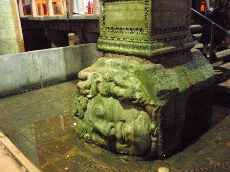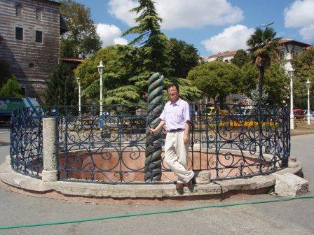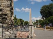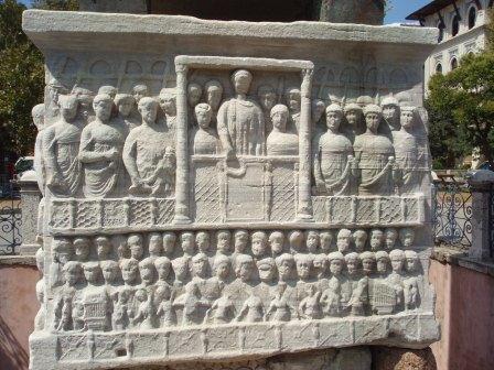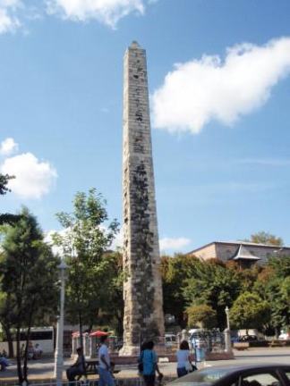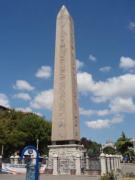 ヒッポドロームに佇んでもかつてここが競技場だった面影はあまり感じられない.しかし当時の建築物がないわけではない.公園内にそびえる3本の塔がそれである.一番南にあるのがオベリスク,これは元々紀元前15世紀古代エジプトのファラオ,トトメス3世が建立したものを4世紀末のローマ皇帝テオドシウス1世がこの地に持ってきたものと言われている.オベリスクが置かれている台座には競技場で優勝者に冠を授ける皇帝や政府高官の姿が描かれている. |
