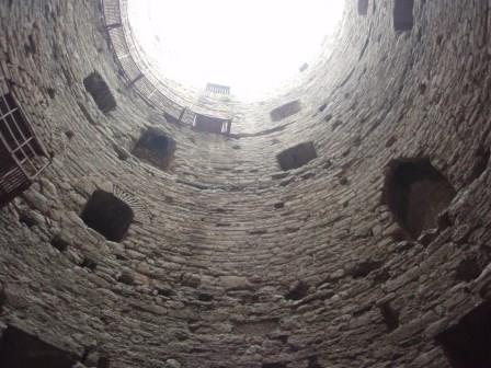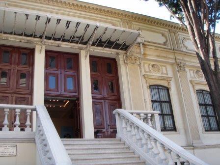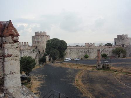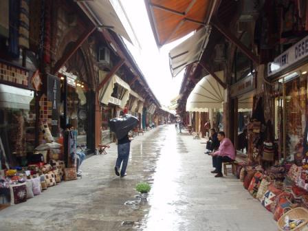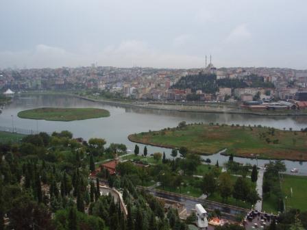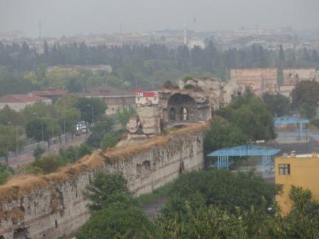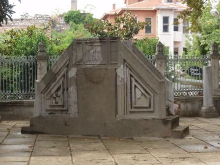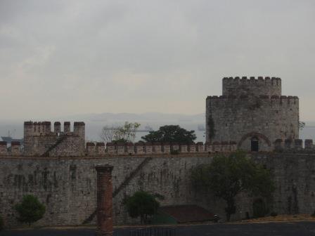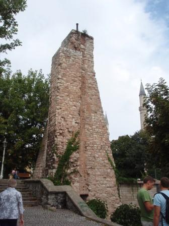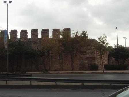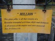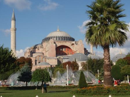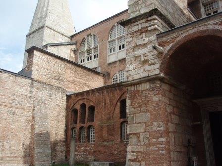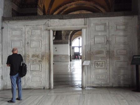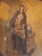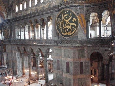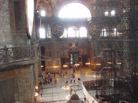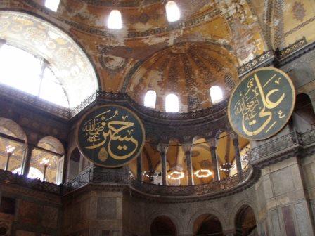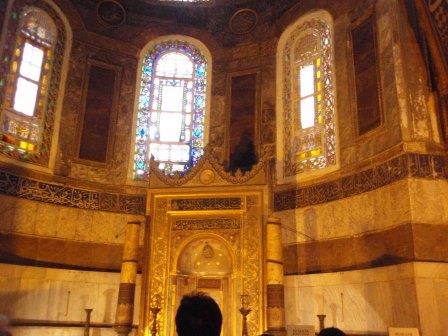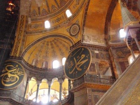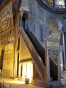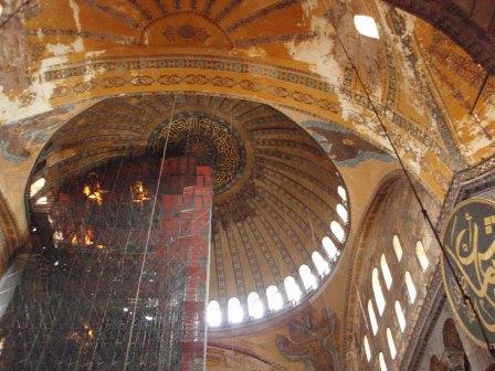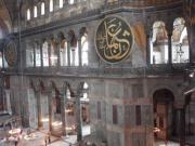 気を取り直してドームの中へ進む.す,凄い!! 高さ50メートルを優に超えるドームはすごい迫力である.ドームの天井には有名な聖母子のモザイクが見られる.壁の金色と上方の小窓から差し込む光でドーム内は厳粛な雰囲気に包まれていた.巨大な建造物を見慣れた現代人でもそう感じるのだから,こういうものに免疫がなかった中世の人間がこのドームを目の当りにしたら,おそらくはここが神の世界に最も近い場所だと信じたであろうことは間違いあるまい(実際,10世紀にキエフ大公国ウラジーミルからここに派遣された使者はこの聖堂で行われる典礼に立ち会い,「まるで天上にいるようだった」との報告をしている).もっとも,ここでも修復の工事が行われていて,地上からドームの4分の1位部分が無粋な骨組みに覆われていたが….一方で,ここがイスラム教のモスクに改装された痕跡とわかるものとしては,メッカの方向を示すミフラーブの存在やムハンマドや正統カリフの名が刻まれた円盤の設置がある.
