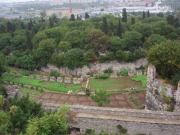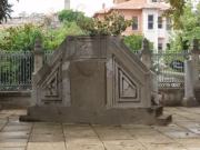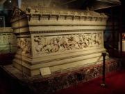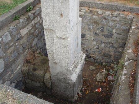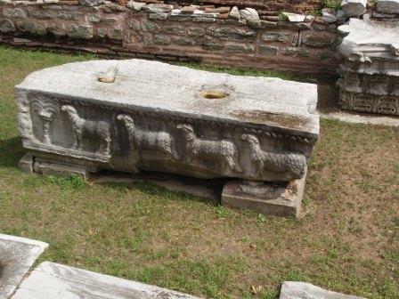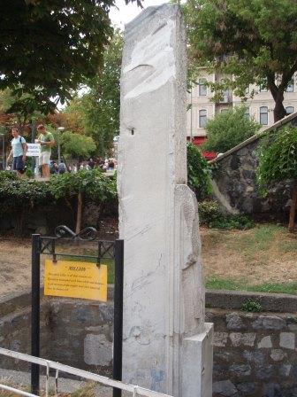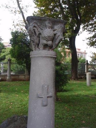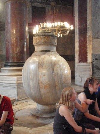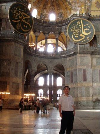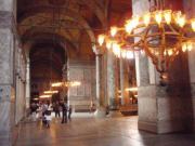 全景を見たらさっそく中に入ることにする.入り口は向かって左側にあり,ここから入っていくのだが,ふと見ると十字架の刻まれた柱のようなものや祭壇の残骸らしきものが無造作に置かれていた.なんだこれは!と思い,そばにあった案内板を読む.それによると,これは5世紀にテオドシウス2世によって造られ,6世紀のニカの乱(ユスチニアヌスの時代に発生し首都が灰燼に帰した民衆反乱)によって破壊された先代の聖ソフィア寺院の遺構なのだそうだ.そんな重要なものをこんなところに転がしておいていいのだろうかと思いながら聖堂の中に入った.入り口から入り拝廊と呼ばれる廊下のような部分を横切ってドームの中へ.実はこの拝廊とドームの境目に有名なモザイク画があるハズなのだが… なんと!工事の足場がモザイクを隠す状態になっているではないか(泣).なんか幸先の悪いアヤソフィアであった.