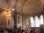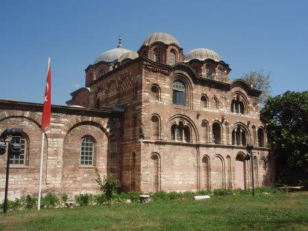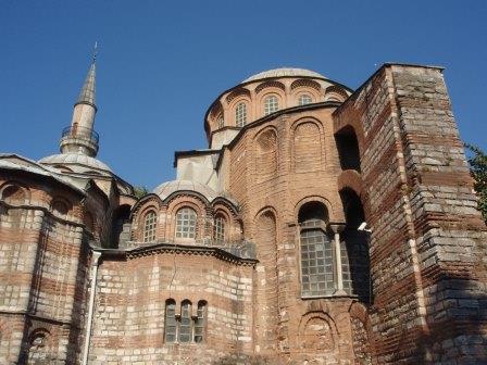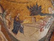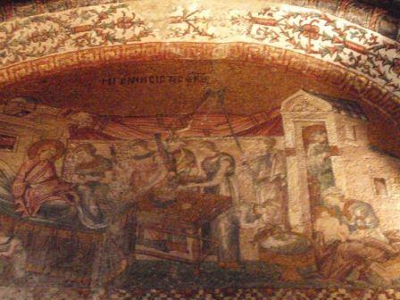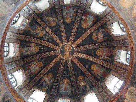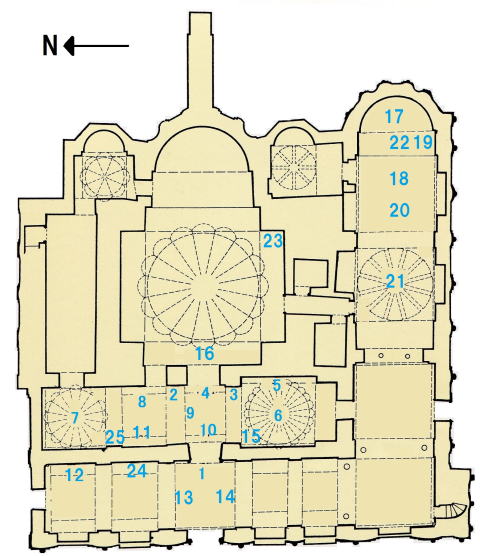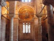 聖堂は入り口付近にあたる外拝廊(ナルテクス),その奥の内拝廊,さらに奥のドームがある身廊,そして南側のパラクレシオンから構成され,ビザンチン末期のたくさんのモザイク画やフレスコ画が施されていた. |