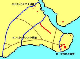 特に395年に帝国が東西に分裂し,西の帝国がゲルマン人に蹂躙されるようになると,東の都となっていたコンスタンティノープルの防衛は極めて重要な問題となり,5世紀の前半に皇帝テオドシウス2世によって堅牢な城壁が築かれることになった.これが現在にまでその姿をとどめるテオドシウスの大城壁である.